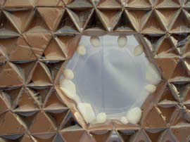 The construction is based on triangular cardboard tubes, known from the FedEx poster shipping boxes. It is an inexpensive mass-product that forms the grid for a 3-dimensional façade structure. Transparent openings can be created by leaving tubes out. The construction forms a pressure envelope around the cardboard elements.