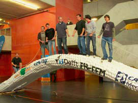 There are different possibilities to build a deflated bridge. One of them is the peanut solution. A material is packed into a pre-shaped bag. The ideal arch form can be identified in a hanging position. After evacuating the air, the construction is stiff and can be turned upside down into its correct position. “Peanuts” represent all positive characteristics a filling material must exhibit: optimum shape for good packing properties, friction due to its rough surface, lightweight. This principle was tested in a 10-meter-long bridge, with a filling material of hollow plastic balls, since peanuts were not readily available in the enormous quantity needed. We do not want to propose this experimental structure for actual bridge constructions. However, it is a great example of testing and verifying assumptions and calculations.