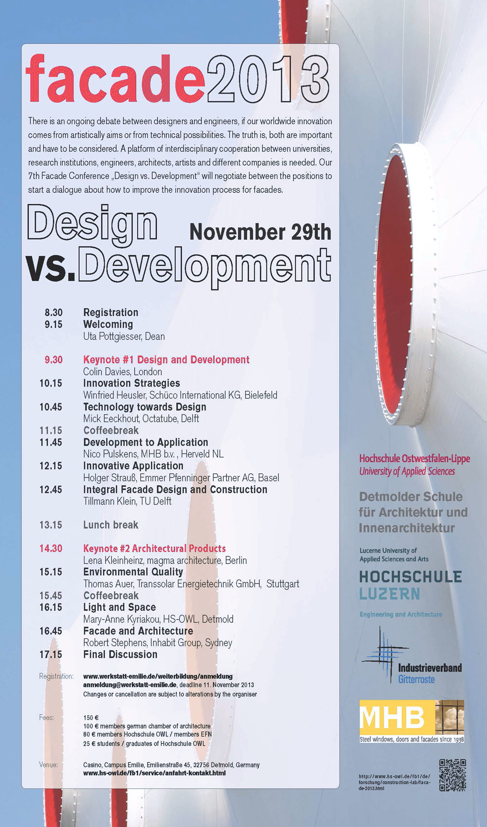 Based on this background, the title of the next facade conference 2013, which will be held on 29 November 2013 in Detmold, is “DESIGN vs. DEVELOPMENT “. The conference will be held at the Emilie campus of the Detmold School of Architecture and Interior Design, where you can meet international representatives from research, development and industry to exchange ideas on how to improve the innovation process in facades. This discussion will be about the economic keys and technological issues facing many European companies and planners. Central question is how trends and developments in the building envelope affect the comfort of interiors and buildings and thereby on human well-being. Speakers will be: Lena Klein Heinz – magma architecture in Berlin, Colin Davies – author from London, Robert Stevens – inhabit group from Sydney / London, Holger Strauss – Emmer Pfenninger from Basel, Thomas Auer – transsolar climate engineering form Stuttgart and others.