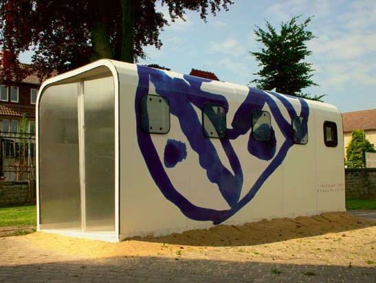 The fiber-reinforced concrete layer provides cooling/heating through the capillary pipes, as well as additional temperature control due to its thermal mass, and efficient radiation heating. The parts of the building conceived as single modules were produced as one large GRP sandwich with a fiberglass-reinforced plastic skin and hard foam core, and then cut to size. The panels can be folded by incisions in the roof area. After the elements are fixed in the desired form, the inside surface of textile-reinforced concrete with inlaid capillary pipes was sprayed.