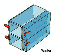 The liquid façade tries to deal with the following factors: load-bearing, thermal mass for energy storage, and different possibilities of thermal insulation. By filling the middle pneumatic element with water, the thermal mass can be used to store energy. By varying the positions of the insulating pneumatics on the outer surface, the insulation properties against the sun and the cold can be controlled.