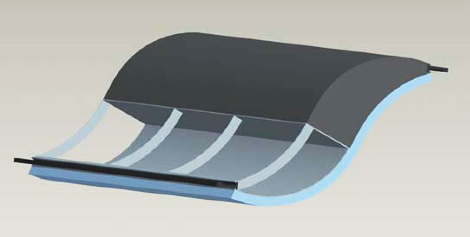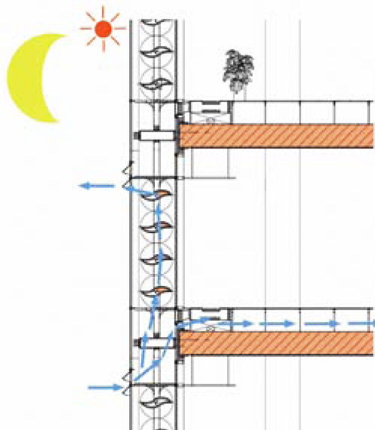 A three-layer element consisting of PCM, insulation and a light-absorbing surface is arranged in a modular system that changes its direction according to the temperature. During the day, the PCM is oriented toward the sun in order to absorb energy. During the night, the module rotates 180° so that the PCM faces the interior space where it releases its energy to warm the room.
