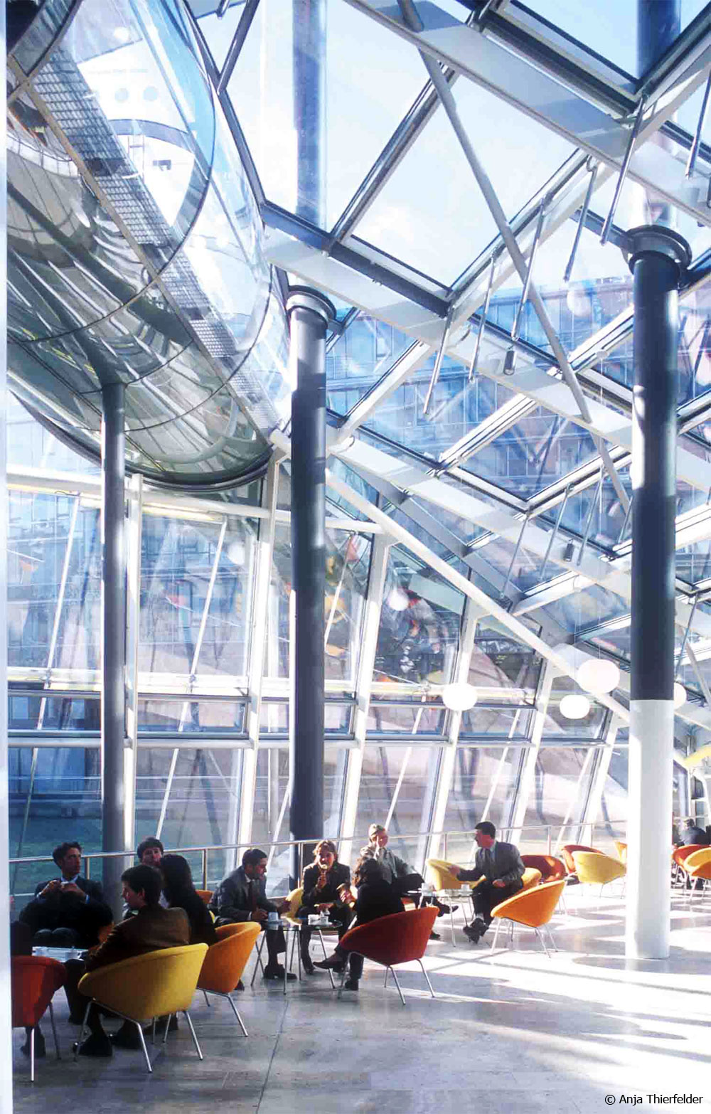 A transparent office complex with a dazzling 17-story high-rise and a compact block construction not exceeding seven stories that wraps around a generous inner courtyard.