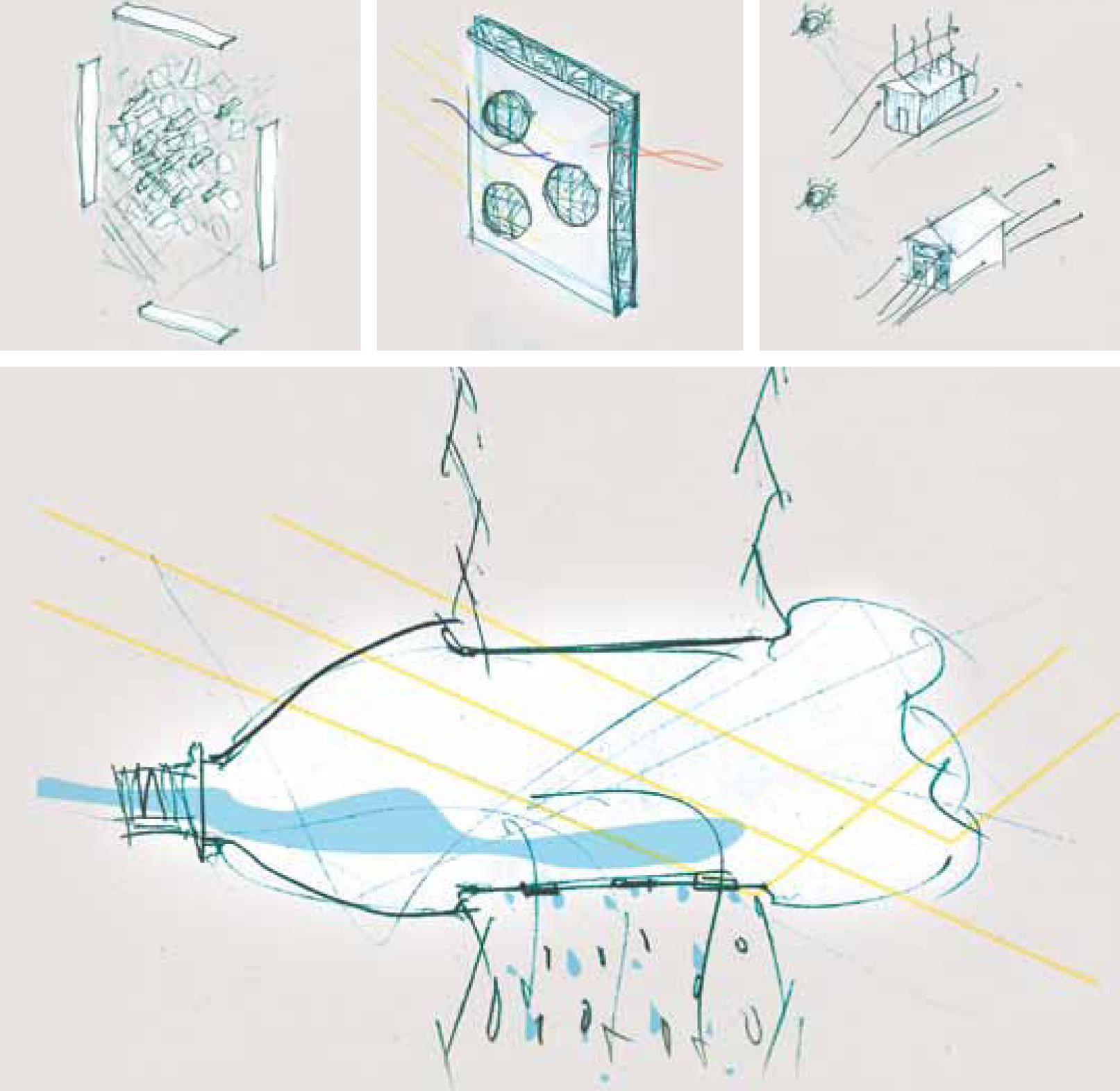 An ‘active’ passive system. This concept uses a panel system that sustains a passive cooling system. Based on existing solar refrigerator systems, the units could be expanded into a wall system for areas with high year round temperatures. The system could be used to assist in the rebuilding of Haiti or similar areas of destruction. It utilizes rubble as the outer layer. This layer heats up and evaporates the moisture into the dirt, which would consequently draw out heat from the interior space.