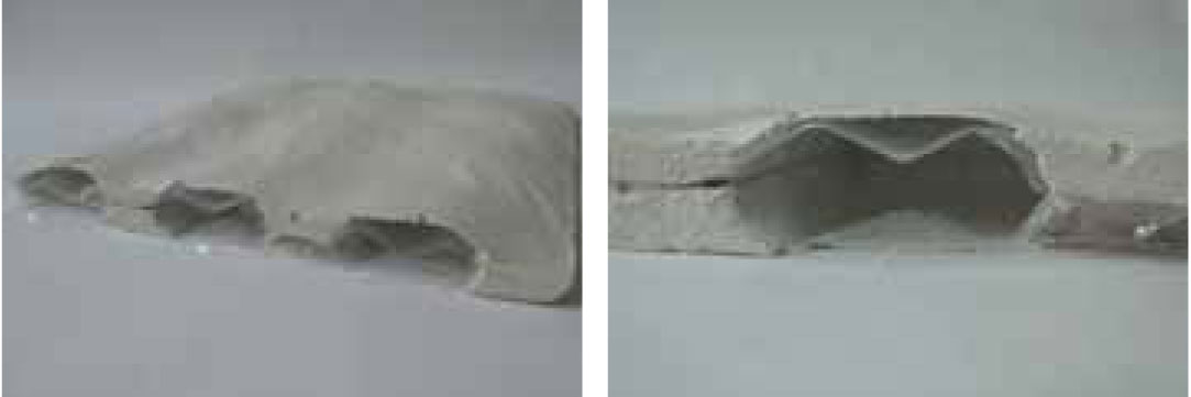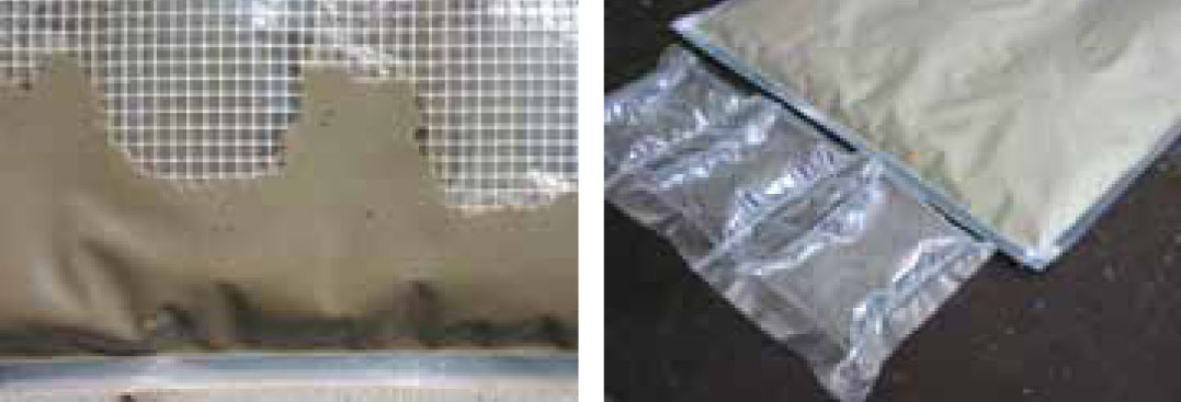 This principle can be used to produce prefabricated parts. The shipping industry offers alternative solutions: based on serial production methods, the mold is built first and then filled with the surface material and rigid foam. Polyester or epoxy is added by vacuum injection to create a sandwich composite structure. Since there is no gravel or other coarser aggregate added to the fiber concrete matrix it can flow easily. Therefore, textile reinforcement or hollow parts can be used. One idea is to pour all dry materials into a vacuum bag and then saturate them with liquid concrete under vacuum. Prefabricated baskets with cavities and specifically arranged reinforcement fibers can thus be produced economically.