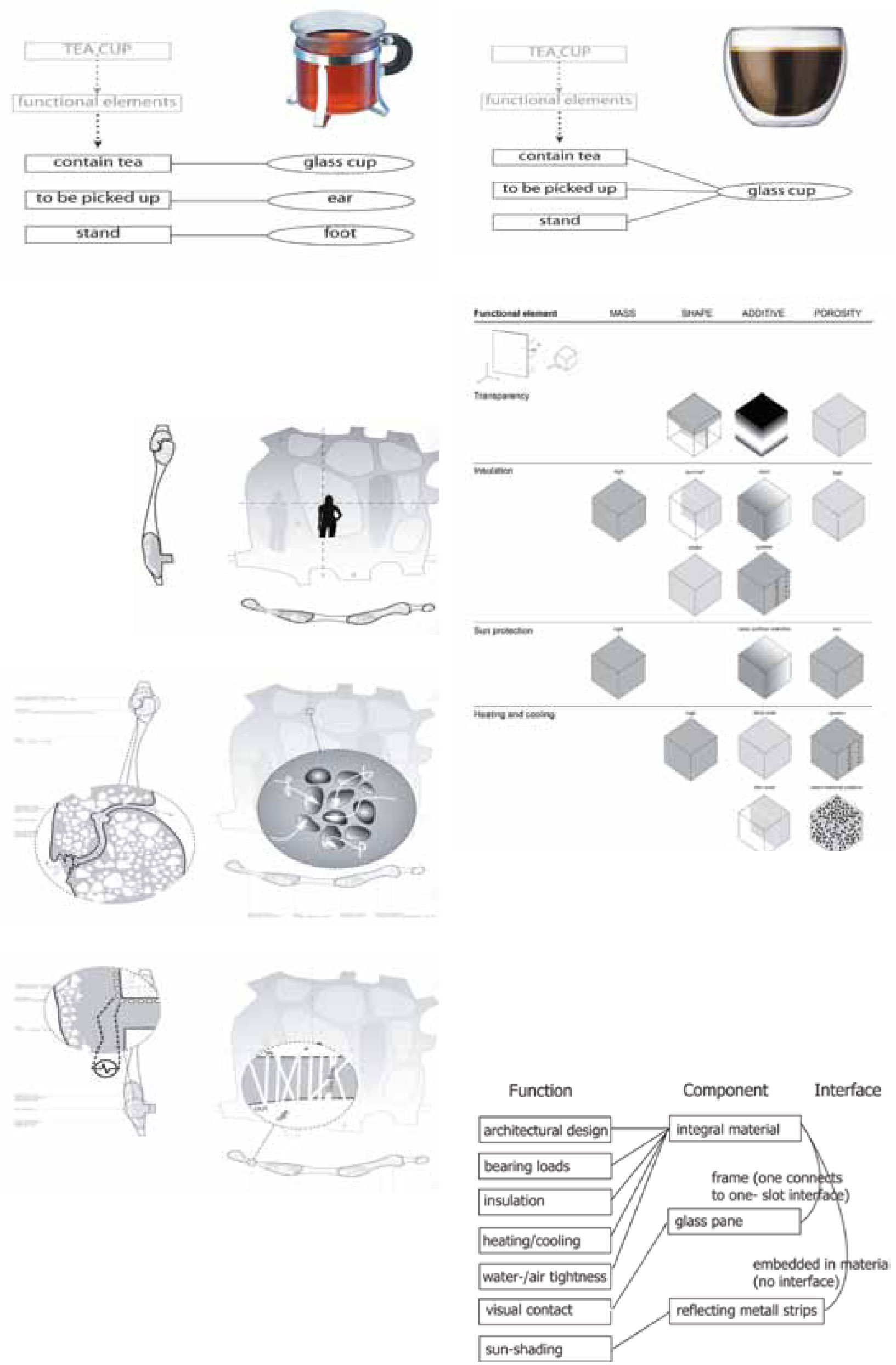 This approach can be explained with the example of a tea cup. In the first cup, each main function is translated into a separate component. The second cup shows an integral architecture. But what does an integral approach mean for façade construction?