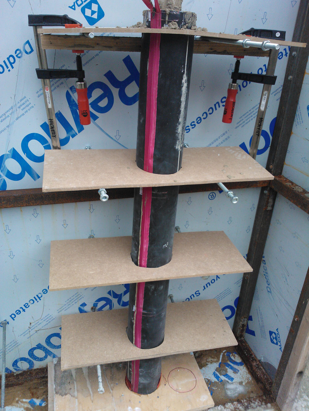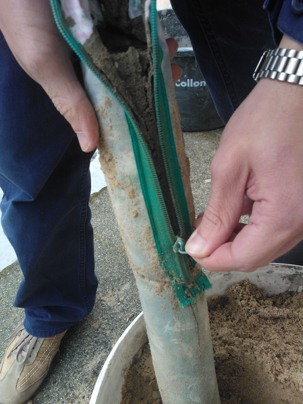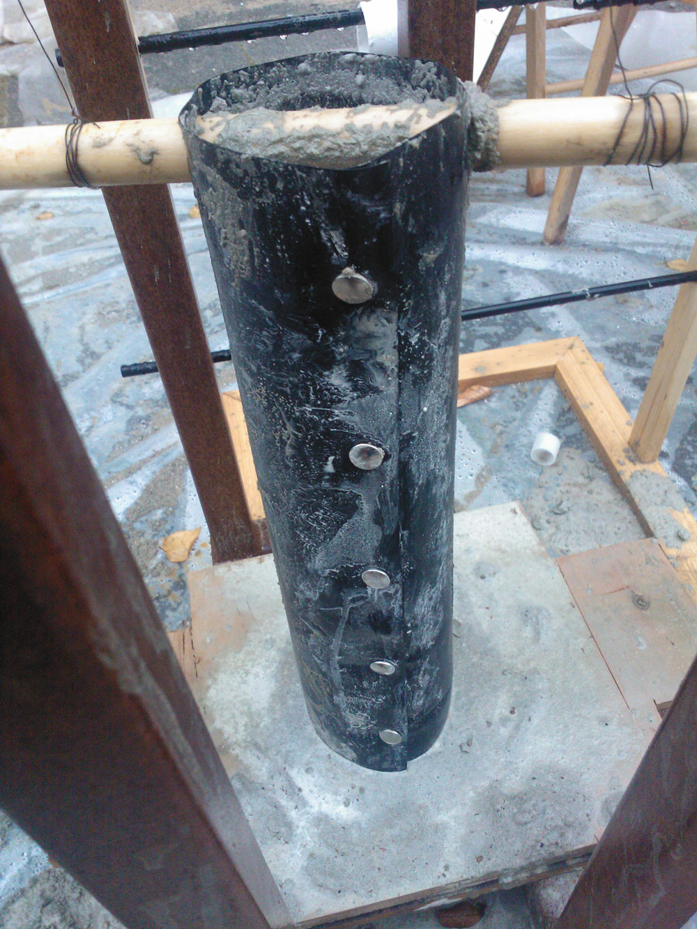 The idea is to come up with a new way to build a formwork for concrete in a way, which is fast and economic. The first attempt was made of cotton connected to a zipper with 8 cm diameter and 38 cm height. To prevent the concrete to deform the formwork, the formwork wrapped in sand. The single-layered cotton provided a good resistant against the concrete pressure but in the other hand taking the formwork away from the concrete was a complex process.