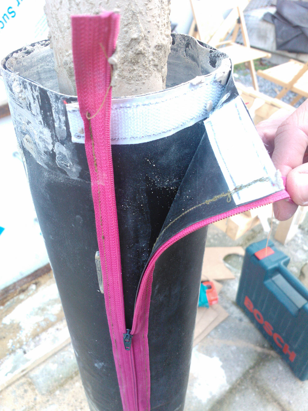 The final attempt was again with a zipper but in combination with the PVC film. The weight had been reduced by placing a tube in the centre of the formwork to form a cavity, also smooth surface for the casted concrete was provided.