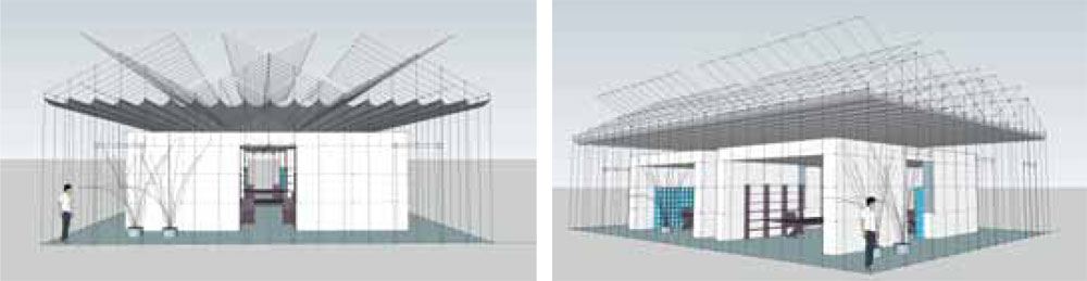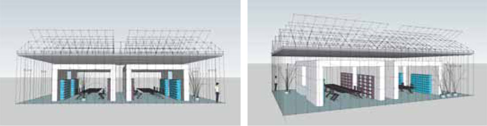 Glass houses are simple and efficient structures which offer rain protection and solar gain in spring and fall. To control the temperature in the summer in addition to ventilation via the roof, the proposal contains water tanks made out of standard PRT water bottles, which can be cooled during night time by cross ventilation and would act as a cold buffer in the daytime. For the winter period the glass house does need to be improved by additional insulation, which is provided in the design via 0.5 x 0.5 x 1 m polystyrol blocks, stacked like brickwork and oversailing the workplaces with a bracing system.