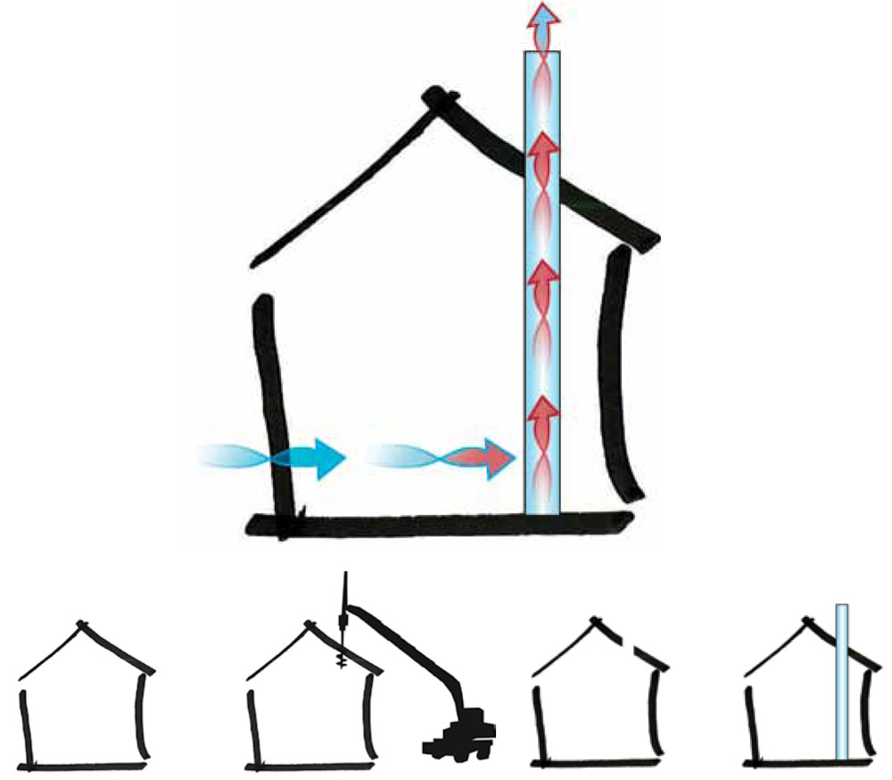 Ventilation is one of the major issues of old houses. One method to enhance ventilation is to introduce a solar chimney into an existing house. The solar chimney generates air movement by creating pressure differences due to the air at the top of the chimney heating up. Besides contributing to the comfort and performance energy of a building, a solar chimney pierces the building and thereby creates an exciting combination of two building volumes.