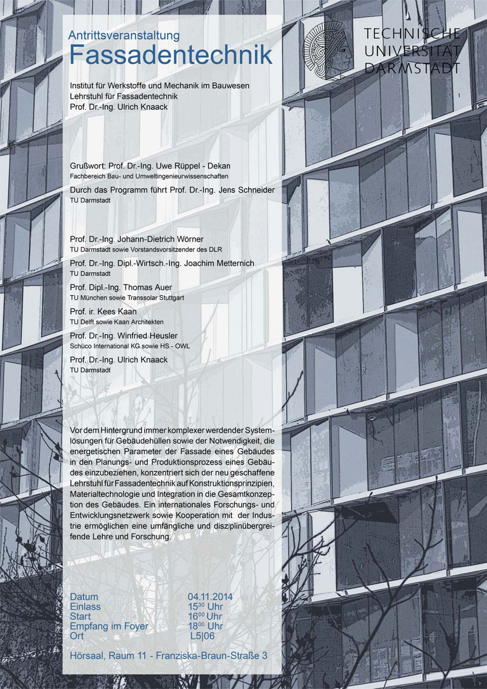 To celebrate this and to give an impulse a kickoff event at 04. of November 2014 is organized, starting at 15.30 with lectures form Prof. Dr Johann-Dietrich Wörner / TU Darmstadt, Prof Dr. Joachim Metternich / TU Darmstadt, Prof Thomas Auer / TU München + Transsolar Stuttgart, Prof Kees Kaan / TU Delft + Kaan Architects and Prof. Dr. Winfried Heusler / HS OWL + Schüco. Ulrich Knaack will closed the session with some words about his plans for Darmstadt.