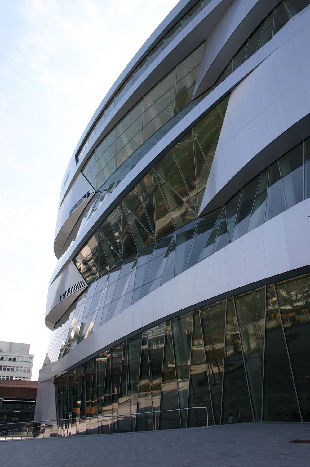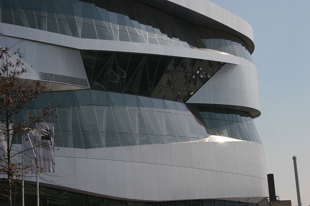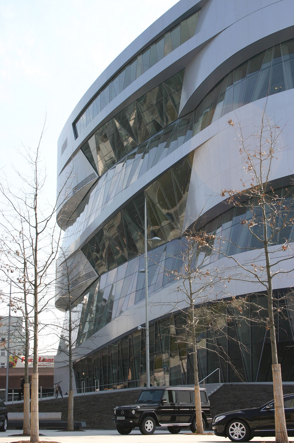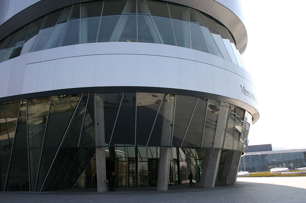 Mercedes Benz Museum was designed to be an icon, which is representing the legacy of Mercedes Benz. A team led by Dutch architecture Ben van Berkel, Caroline Bos and Tobias Walliser, was responsible for the design of the museum. The building had to be designed and constructed in record time as Mercedes-Benz did not want to let go of the chance to be ready before the world cup in Germany. The geometry of the building had been defined by 3D model. To construct the complex over 110,000 tons of concrete, the outer envelope is constructed out of aluminium plates and glass. The glass is used as the front windows and made of trapezoidal panels supported by steel profiles. The glass is colorless and insulated. The climate engineer Matthias Schuler / Transsolar was responsible for the climate design.