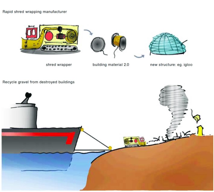 In cases of hurricanes and blizzards that devastate entire regions of the inhabited world, Rapid Shred Wrapping could help to recycle the materials that remain after such a disaster. The Shred Wrapping Manufacturer is brought to the area of destruction and recycles the rubble into new building material. From this material, new habitats are built on the site. The material could either be a new kind of OSB board or made into yardage material on reels for easy storage. Layered architecture could be built from such reeled material (e.g., Adobe or igloo structures.).