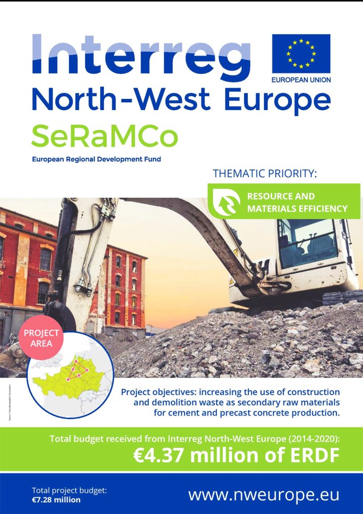 To make the most out of the available resources, SeRaMCo aims to replace primary raw materials with the high-quality materials recycled from CDW, e.g. concrete, bricks, tiles and ceramics (CBTC), in the production of the cement and concrete products for use in NWE.