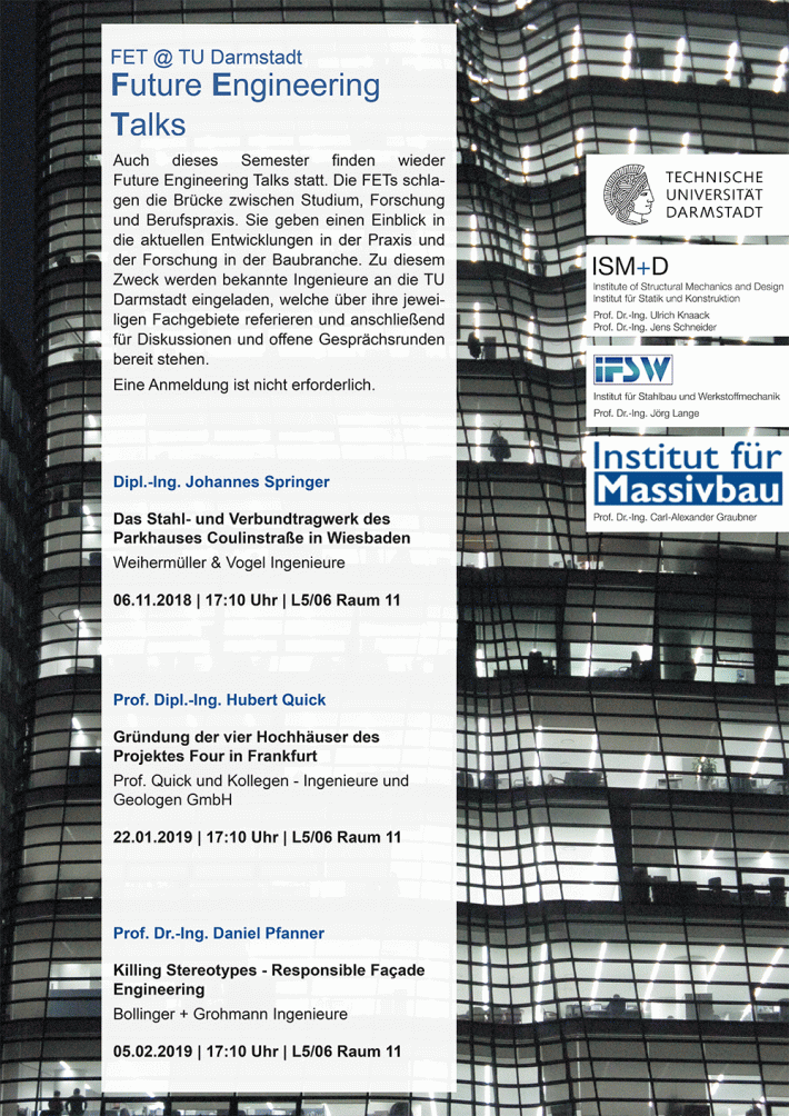 Each semester, future engineering talks are held in TU Darmstadt. the idea is to fill the gap between research and praxis and to give the students and the attendees an overview of the last developments in the building industry.