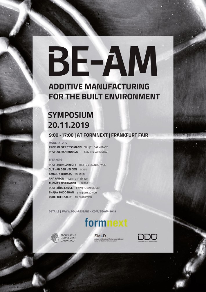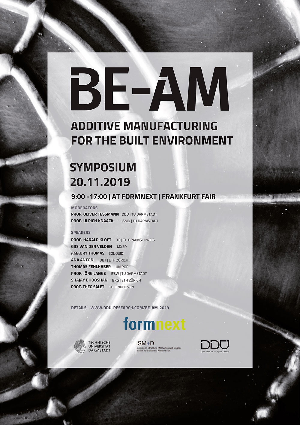On November 20, 2019, the symposium BE-AM | Built Environment – Additive Manufacturing will take place at the FormNext, the largest trade far for additive manufacturing in Frankfurt. For the fifth time, Prof. Dr.-Ing. Ulrich Knaack (Institute of Structural Mechanics and Design, ISMD at TU Darmstadt) and Prof. Dr.-Ing. Oliver Tessmann (Digital Design Unit, DDU at TU Darmstadt) invite experts from practice, research and industry to explore the current status and future potential of additive manufacturing for construction and architecture.