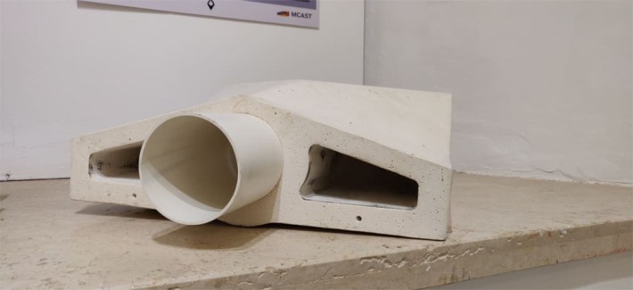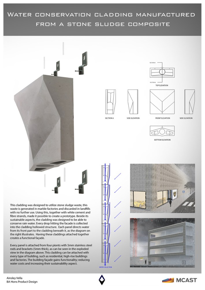 Ainsley Vella, B.A hons Product Design, MCAST, Malta. The cladding was designed to utilize stone sludge waste, which is generated in marble factories and discarded in landfills with no further use. Using the recycled material in combination with cement and fiber strands, a light-weight stone cladding system was developed as a rain-water façade collector. In return, the collected rainwater can be stored for further use in the building it clads.