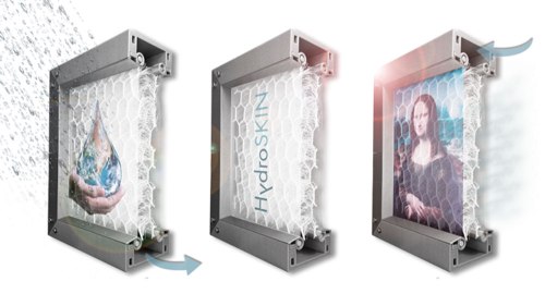 HydroSKIN is the “functional clothing” for our buildings! The lightweight façade elements made of textiles and membranes absorb rainwater. This not only relieves the burden on the urban sewage system to prevent flooding, but also turns rain into a usable resource to reduce drinking water and energy consumption inside a building. On hot days, water is released into the textile façade, for evaporative cooling the building and the urban environment – sustainably without air conditioning. Due to their low weight, HydroSKIN façade elements can be retrofitted to all new and existing buildings – and in as many different and customizable designs as our clothing: various colors, prints with texts and images – there are no limits to creativity.