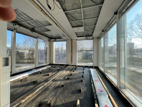 In line with Alessandra’s plans to update the lab’s systems, we also removed the old floor. This was not just any floor, but part of the original HVAC system: an air distribution channel where conditioned air enters through small ventilation holes in the floor and exits through central vents in the ceiling.