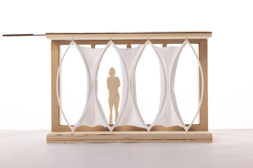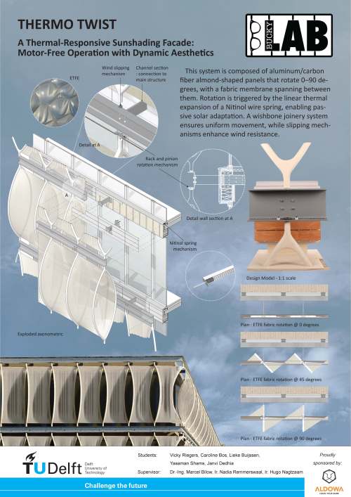 Developed by Vicky Riegers, Caroline Bos, Lieke Buijssen, Yasaman Shams, and Janvi Dedhia, and guided by Dr.-Ing. Marcel Bilow, Ir. Nadia Remmerswaal, and Ir. Hugo Nagtzaam, this prototype explores passive kinetic façadesusing the smart alloy Nitinol.