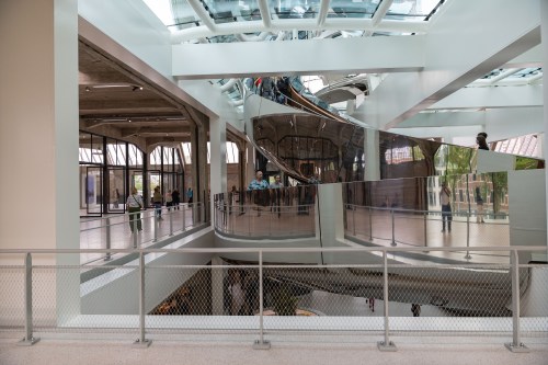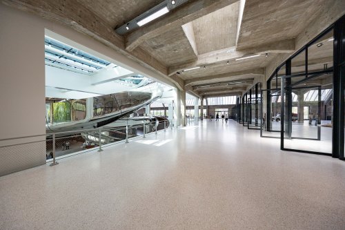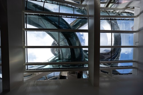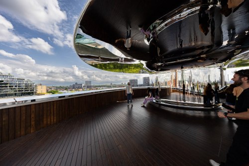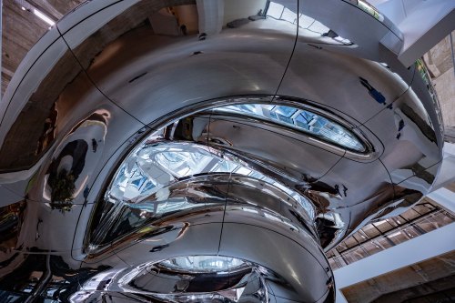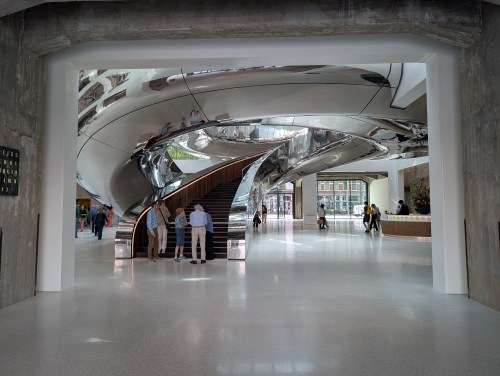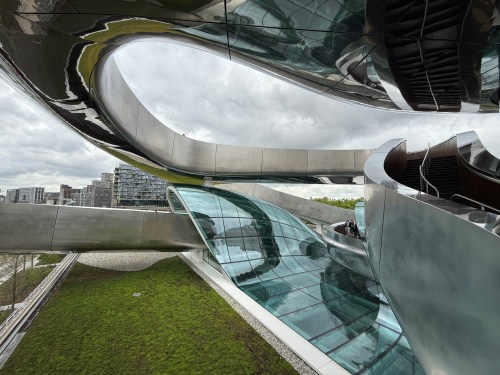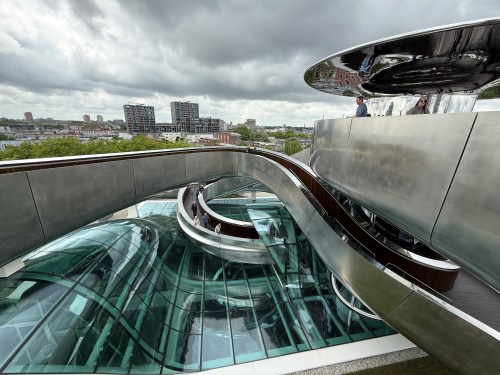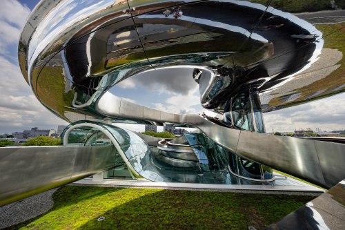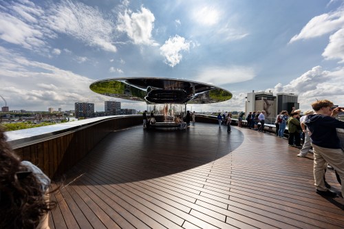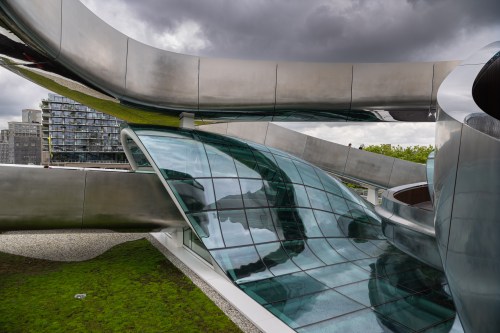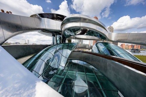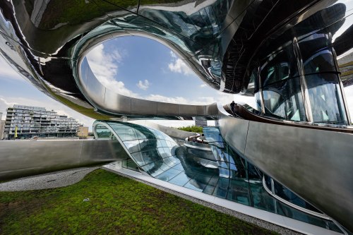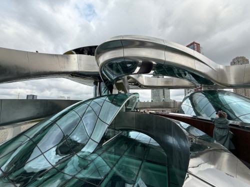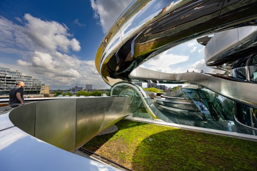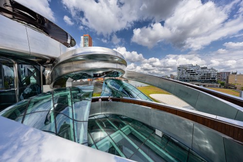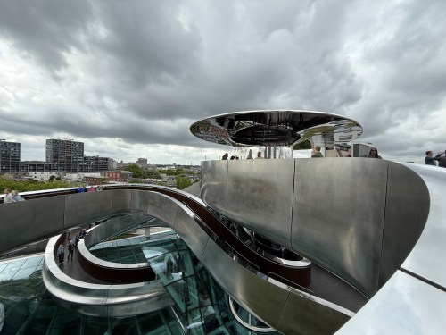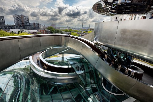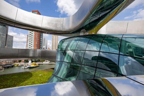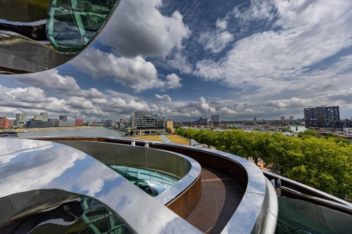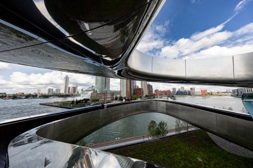 Housed in a restored 1923 harbour warehouse, the museum combines old industrial character with a striking new centrepiece: the “Tornado”, a sculptural double-helix staircase by MAD Architects (Ma Yansong). The reflective stainless-steel skin twists 30 metres up through the old structure and leads to a rooftop platform overlooking the Maas. The warehouse renovation itself was done with great care by Bureau Polderman, with support from EGM Architects on the Tornado element.