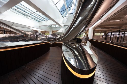 What we love here is the contrast: raw concrete, big industrial windows, and then this polished, swirling tower of steel and timber. It’s a perfect example of how adaptive reuse can become something bold without losing its history.