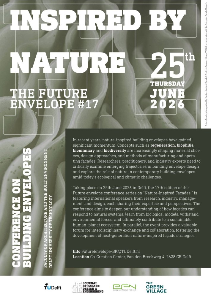 On 25 June 2026, the 17th Future Envelope Conference in Delft will focus on “Nature-Inspired Façades.” International experts from research, industry, and design will share insights into how façades can respond to natural systems, learn from biological models, withstand environmental forces, and contribute to a sustainable human–planet relationship. The event offers a valuable platform for interdisciplinary exchange and for advancing next-generation, nature-inspired façade strategies.