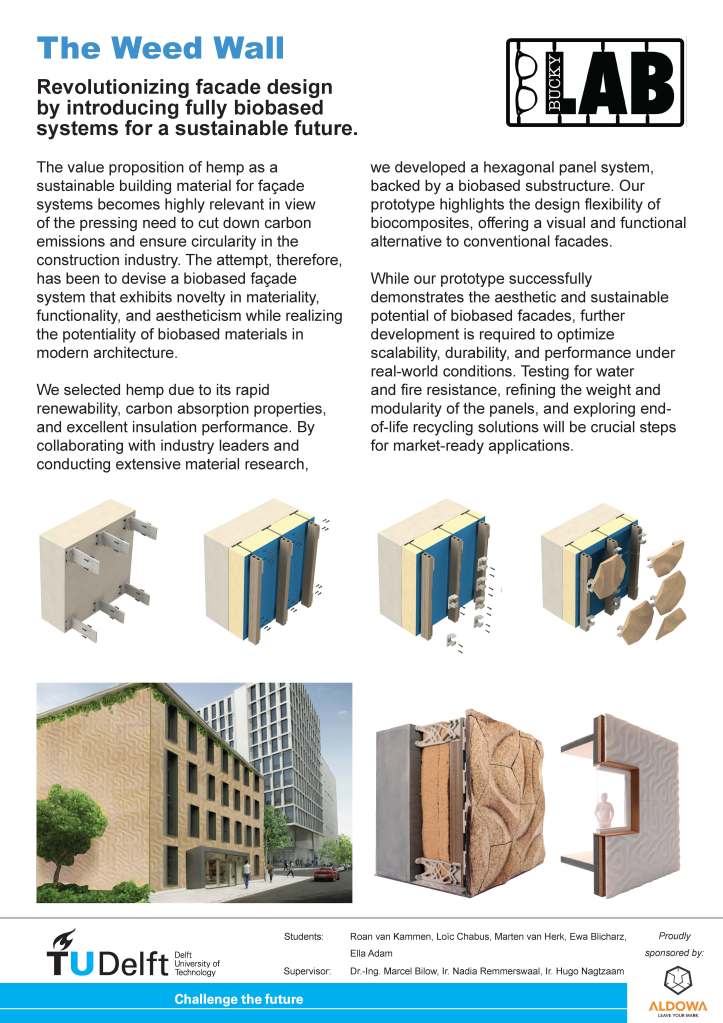 The Weed Wall explores the potential of hemp as a fully biobased façade system, responding to the urgent need to reduce carbon emissions and improve circularity in the construction industry. Developed as a Bucky Lab project at TU Delft, the research focuses on material innovation, architectural performance, and expressive design. Lignitec a start up from Delft helped the students to develop the facade panels.