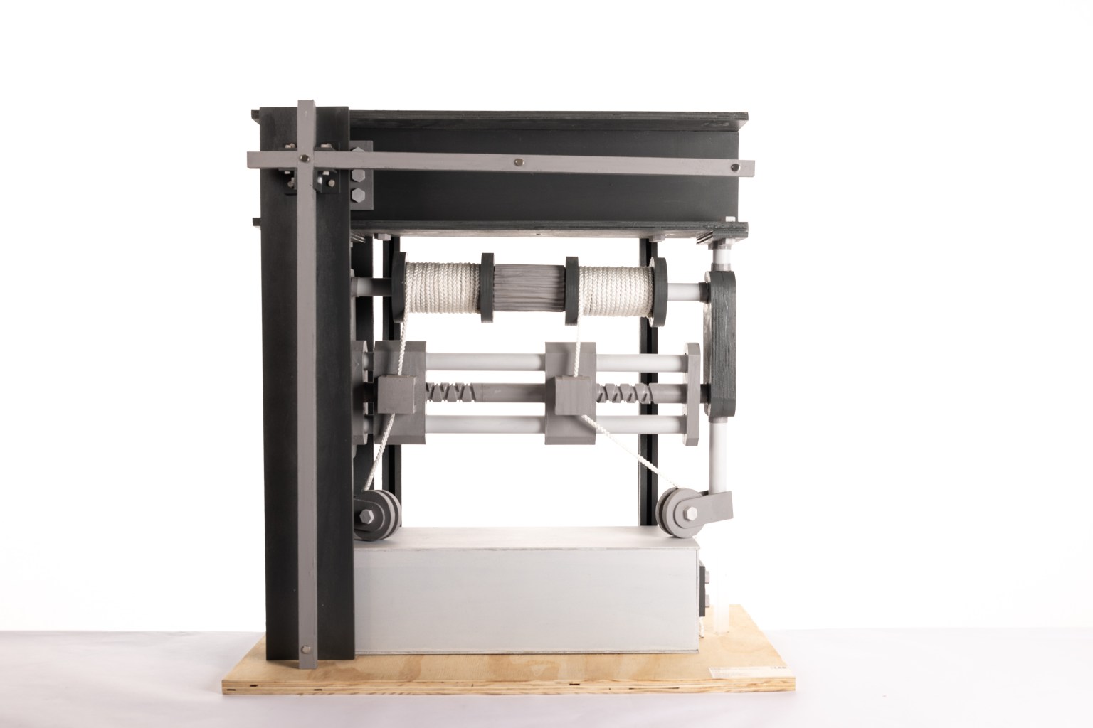 When surplus energy is available – for instance from integrated PV panels – the system lifts a weight. Energy is stored as potential energy. When needed, the weight is lowered again, driving a generator.
