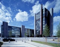 /// Debitel Headquarters The headquarters of the telecommunications company Debitel comprises a high-rise building and four oblong low-rise buildings that are connected with the high-rise through a glass corridor 100 m (110 yd) long. The entire complex is grouped around