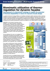 /// Biomimetic utilization of thermoregulation for dynamic façades Development of a biomimetic ontology to exploit the potential of thermal adaptability in nature for dynamic facade design. PhD researcher: Dipl.-Ing. Susanne Gosztonyi Promoter: Prof. Dr. Ing. Ulrich Knaack Co-Promoter: Prof. George Jeronimidis,